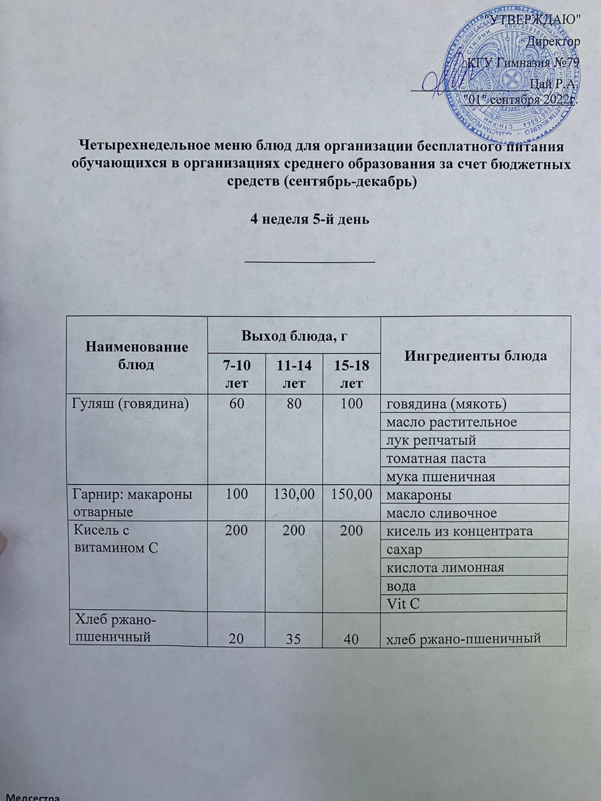 Меню блюд для организации бесплатного питания отдельных категорий обучающихся в организациях среднего образования за счет бюджетных средств