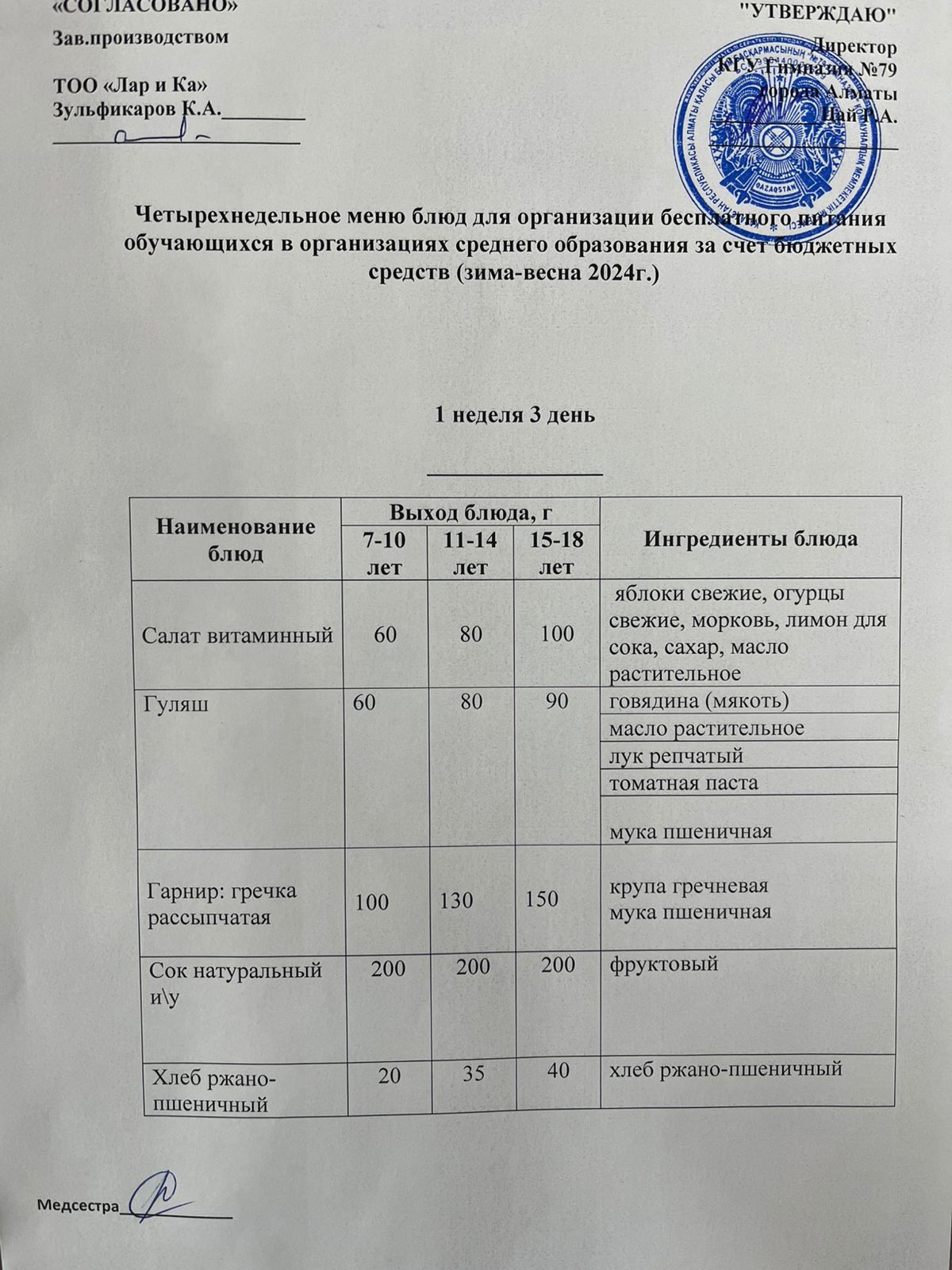 Тегін тамақтануды ұйымдастыруға арналған тағамдар мәзірі (қыс-көктем) / Меню блюд для организации бесплатного питания (зима-весна)