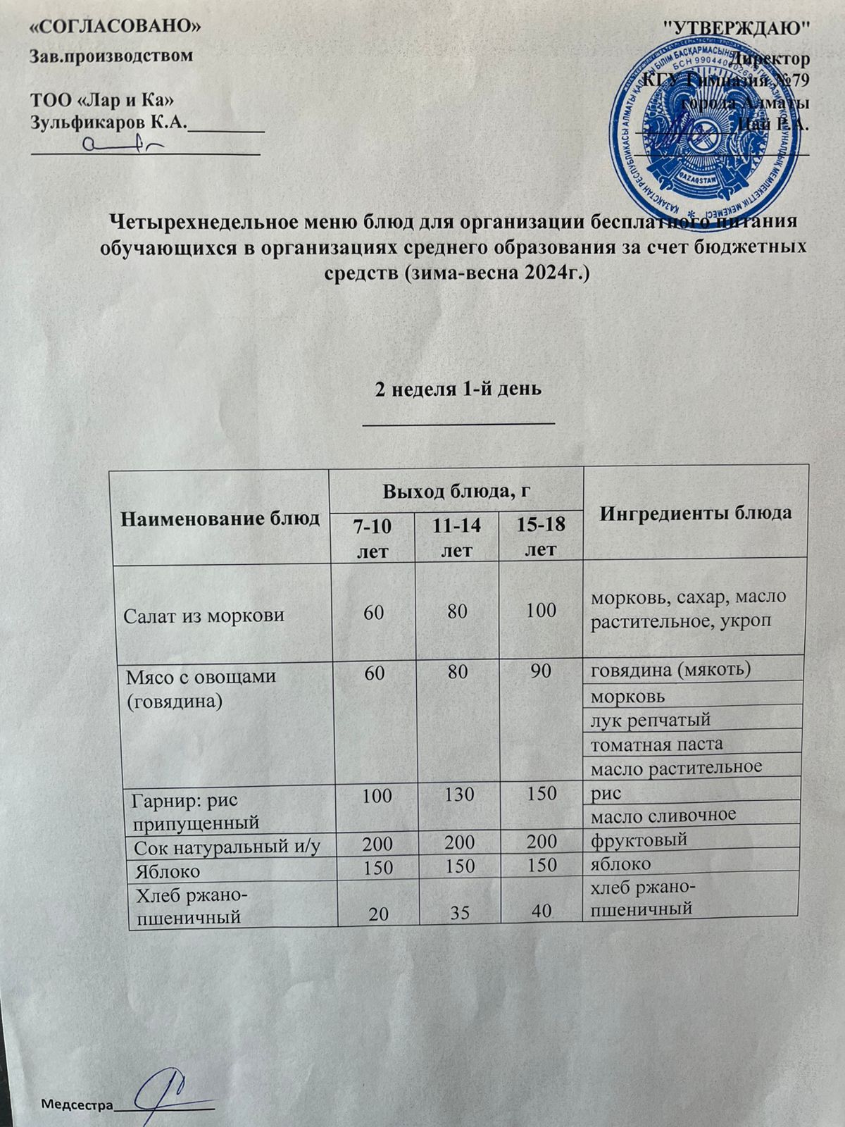 Тегін тамақтануды ұйымдастыруға арналған тағамдар мәзірі (қыс-көктем) / Меню блюд для организации бесплатного питания (зима-весна)