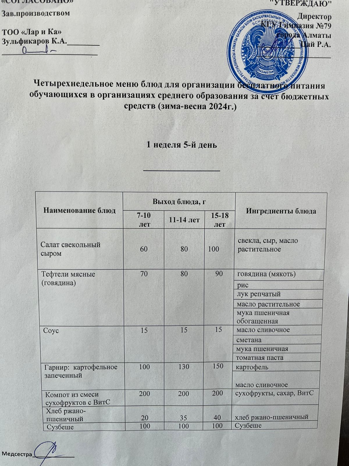 » Тегін тамақтануды ұйымдастыруға арналған тағамдар мәзірі (қыс-көктем)