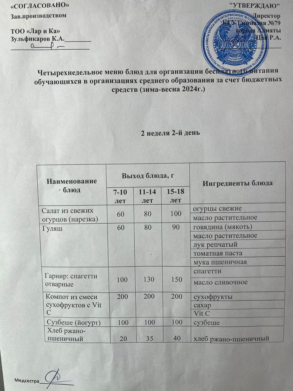 Тегін тамақтануды ұйымдастыруға арналған тағамдар мәзірі (қыс-көктем) / Меню блюд для организации бесплатного питания (зима-весна)