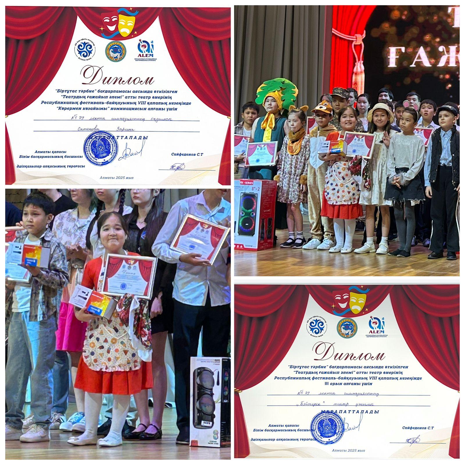 "Біртұтас тәрбие" бағдарламасы аясында "Театрдың ғажайып әлемі" атты республикалық театр өнері фестивалі-байқауының 8-ші қалалық кезеңі өтті. №79 гимназияның "Бәйтерек" театр ұжымы қалалық театрлар арасында 3 орынды иеленді! Бұл талант, еңбек және сахнаға деген сүйіспеншілік арқылы қол жеткізілген лайықты нәтиже. Ал 4 "А" сынып оқушысы Сатенова Зарина көрермендердің жүрегін жаулап алып, "Көрермендер көзайымы сыйлығы" номинациясының жеңімпазы атанды! Оның шынайылығы, шеберлігі мен харизмасы көрермендерді бей-жай қалдырмады. Сондай — ақ, балалар шығармашылығын дамытуға қосқан үлесі үшін театр ұжымының жетекшілері - Р.И. Савазова, Е.Б. Цой және Г.Н. Долгополова алғыс хаттармен марапатталды! Алда-одан да жарқын рөлдер, қошемет пен шабыт күтіп тұр!