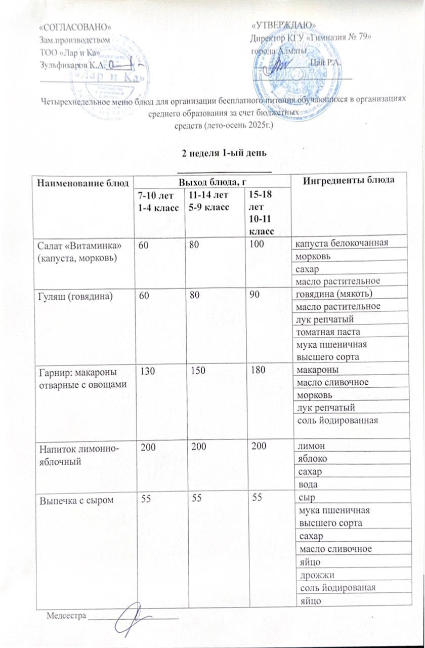 » Тегін тамақтануды ұйымдастыруға арналған тағамдар мәзірі (жаз-күз)