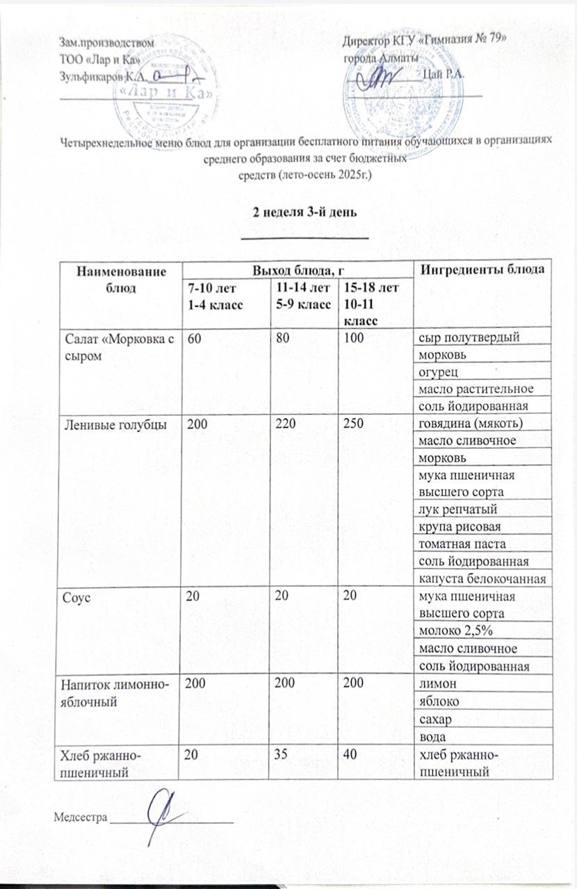 » Тегін тамақтануды ұйымдастыруға арналған тағамдар мәзірі (жаз-күз)