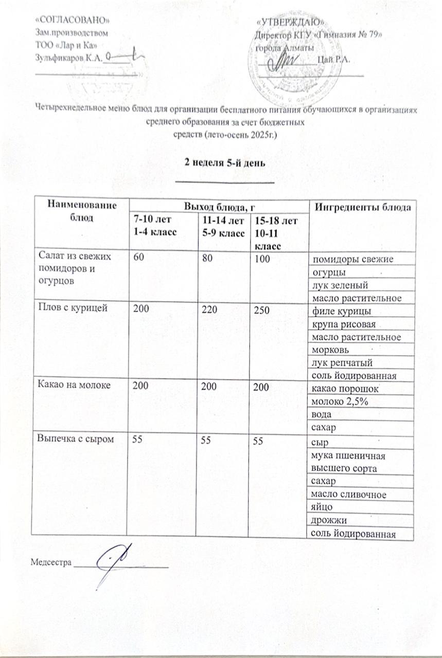 » Тегін тамақтануды ұйымдастыруға арналған тағамдар мәзірі (жаз-күз)
