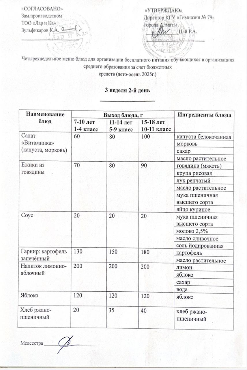 » Тегін тамақтануды ұйымдастыруға арналған тағамдар мәзірі (жаз-күз)