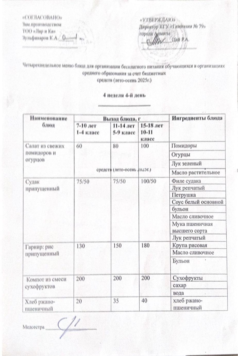» Тегін тамақтануды ұйымдастыруға арналған тағамдар мәзірі (жаз-күз)