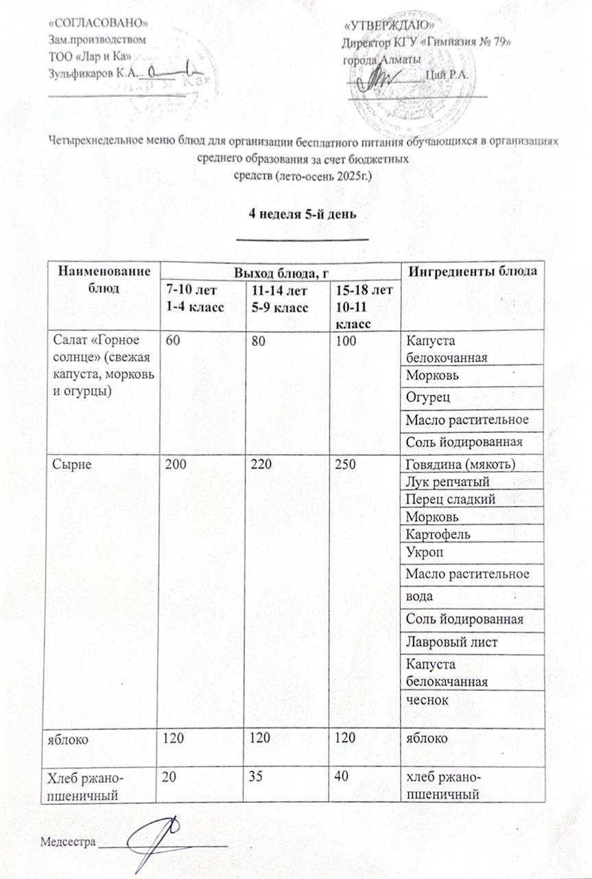 » Тегін тамақтануды ұйымдастыруға арналған тағамдар мәзірі (жаз-күз)