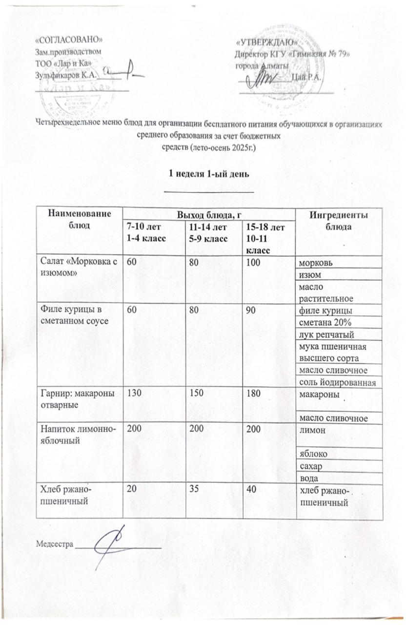 » Тегін тамақтануды ұйымдастыруға арналған тағамдар мәзірі (жаз-күз)