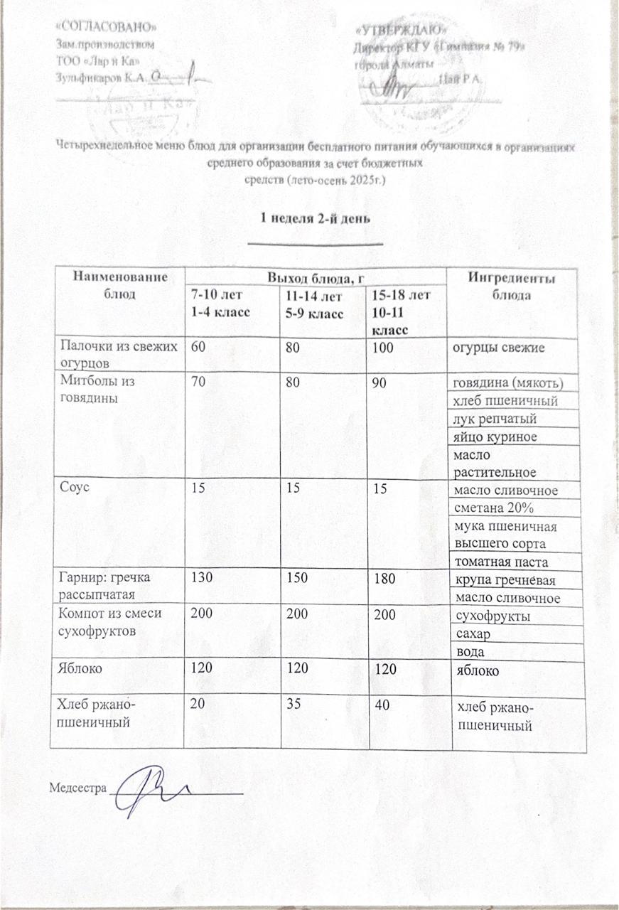 » Тегін тамақтануды ұйымдастыруға арналған тағамдар мәзірі (жаз-күз)