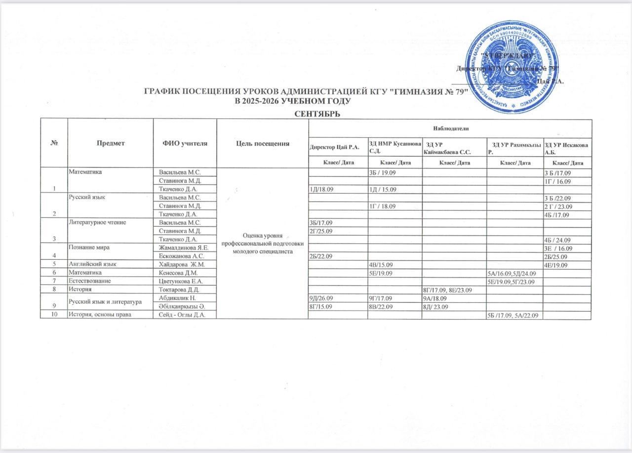 Мектеп әкімшілігінің сыныпқа бару кестесі