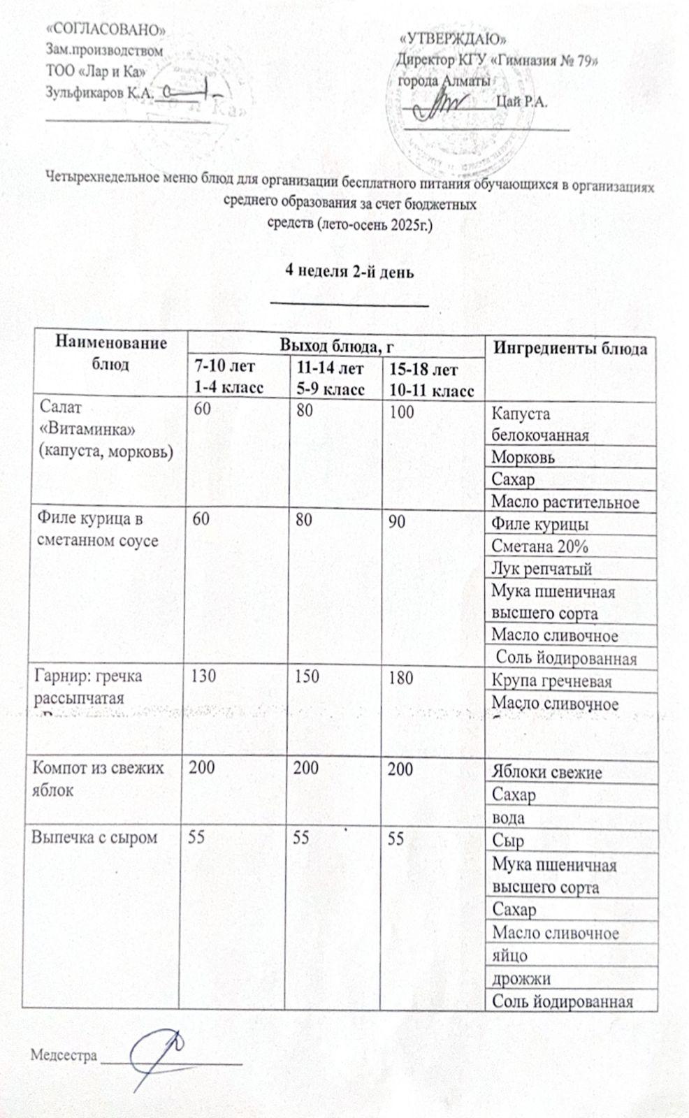 » Тегін тамақтануды ұйымдастыруға арналған тағамдар мәзірі (жаз-күз)