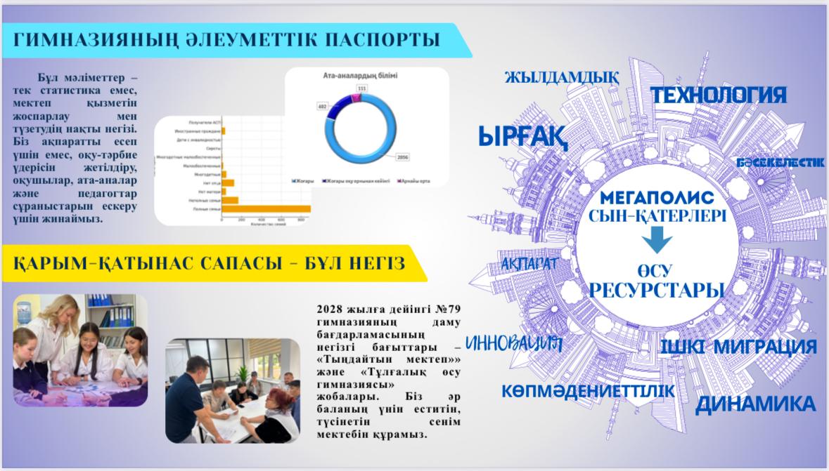 Жан жылуынсыз ешқандай стратегия табысты болмайды. 2028 жылға дейінгі №79 гимназияның даму бағдарламасының негізгі бағыттары – «Үніңе құлақ түретін мектеп» және «Тұлғалық өсу гимназиясы» жобалары.