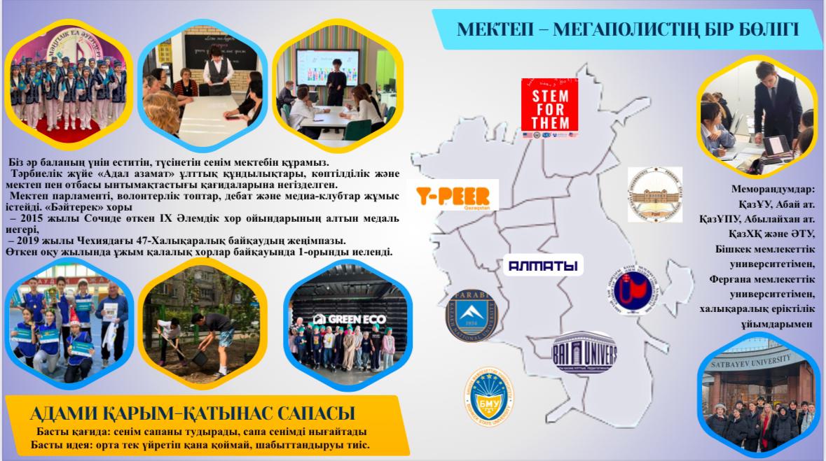 Алматы – барлық сала қарқынды дамып келе жатқан қала, сондықтан білім беру жүйесі де бұл үдеріспен қатар дамуы тиіс. Біздің міндетіміз – жай ғана оқыту емес, оқушыны мегаполис экожүйесінде өмір сүруге бейімдеу. Бұл жерде білім, икемділік және жауапкершілік – табыстың негізгі шарты.