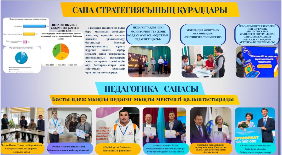 Біздің түсінігімізде сапа - журналдағы баға емес. Гимназиядағы сапа жүйесі төрт құрамдас бөлікке негізделген: Білім сапасы – Педагогика сапасы – Қарым-қатынас сапасы – Орта сапасы.