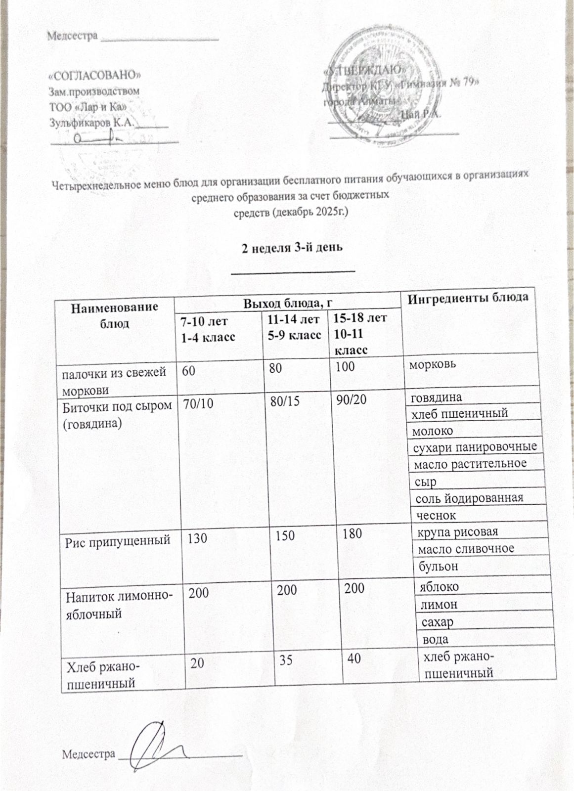 Тегін тамақтануды ұйымдастыруға арналған тағамдар мәзірі (қыс-көктем) / Меню блюд для организации бесплатного питания (зима-весна)