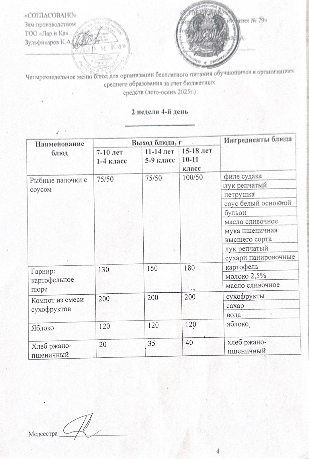 Тегін тамақтануды ұйымдастыруға арналған тағамдар мәзірі (қыс-көктем) / Меню блюд для организации бесплатного питания (зима-весна)