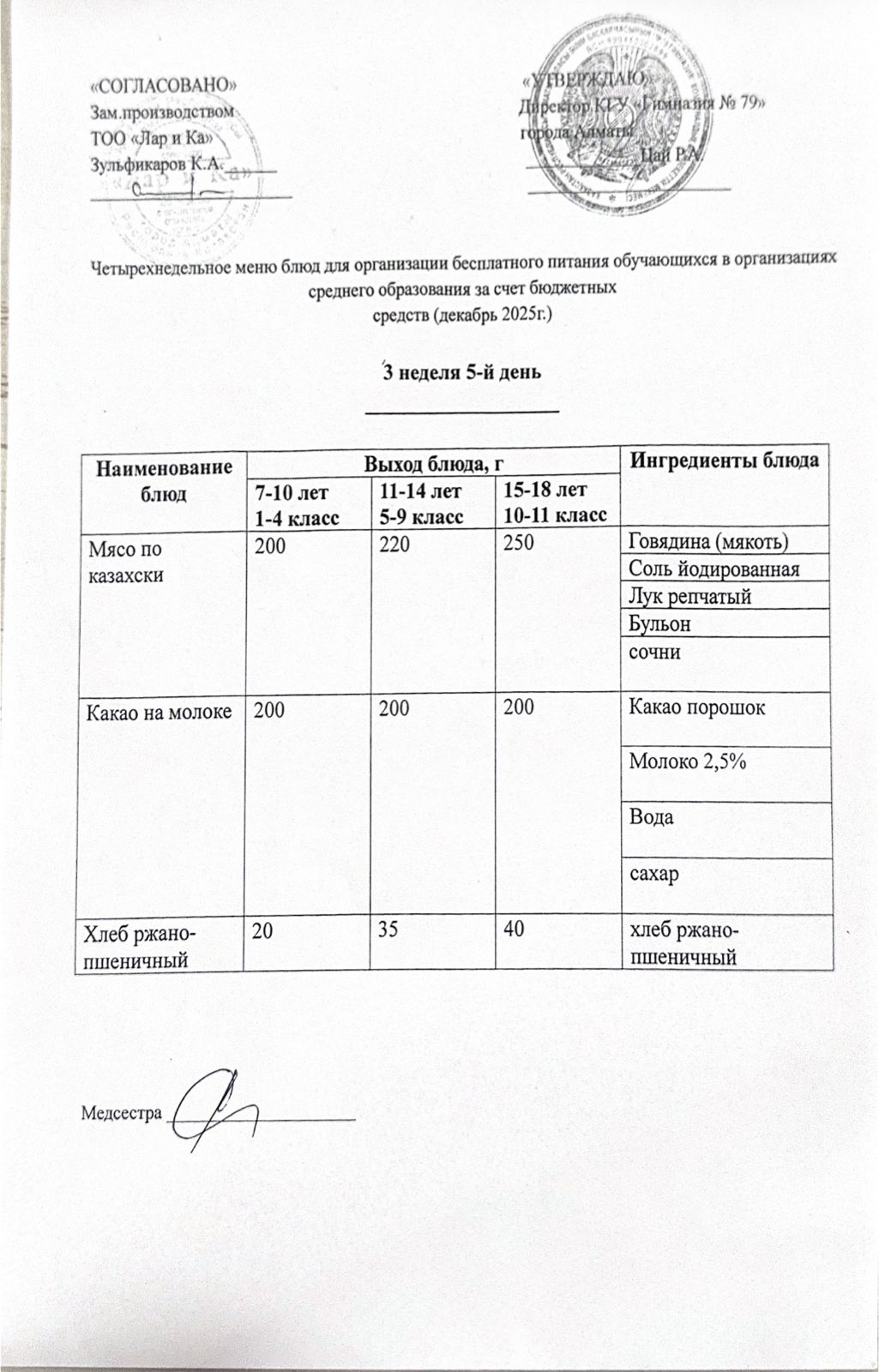 Тегін тамақтануды ұйымдастыруға арналған тағамдар мәзірі (қыс-көктем) / Меню блюд для организации бесплатного питания (зима-весна)