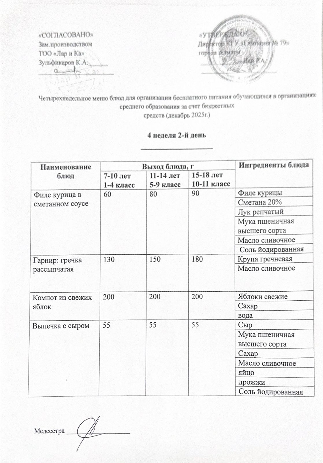 Тегін тамақтануды ұйымдастыруға арналған тағамдар мәзірі (қыс-көктем) / Меню блюд для организации бесплатного питания (зима-весна)