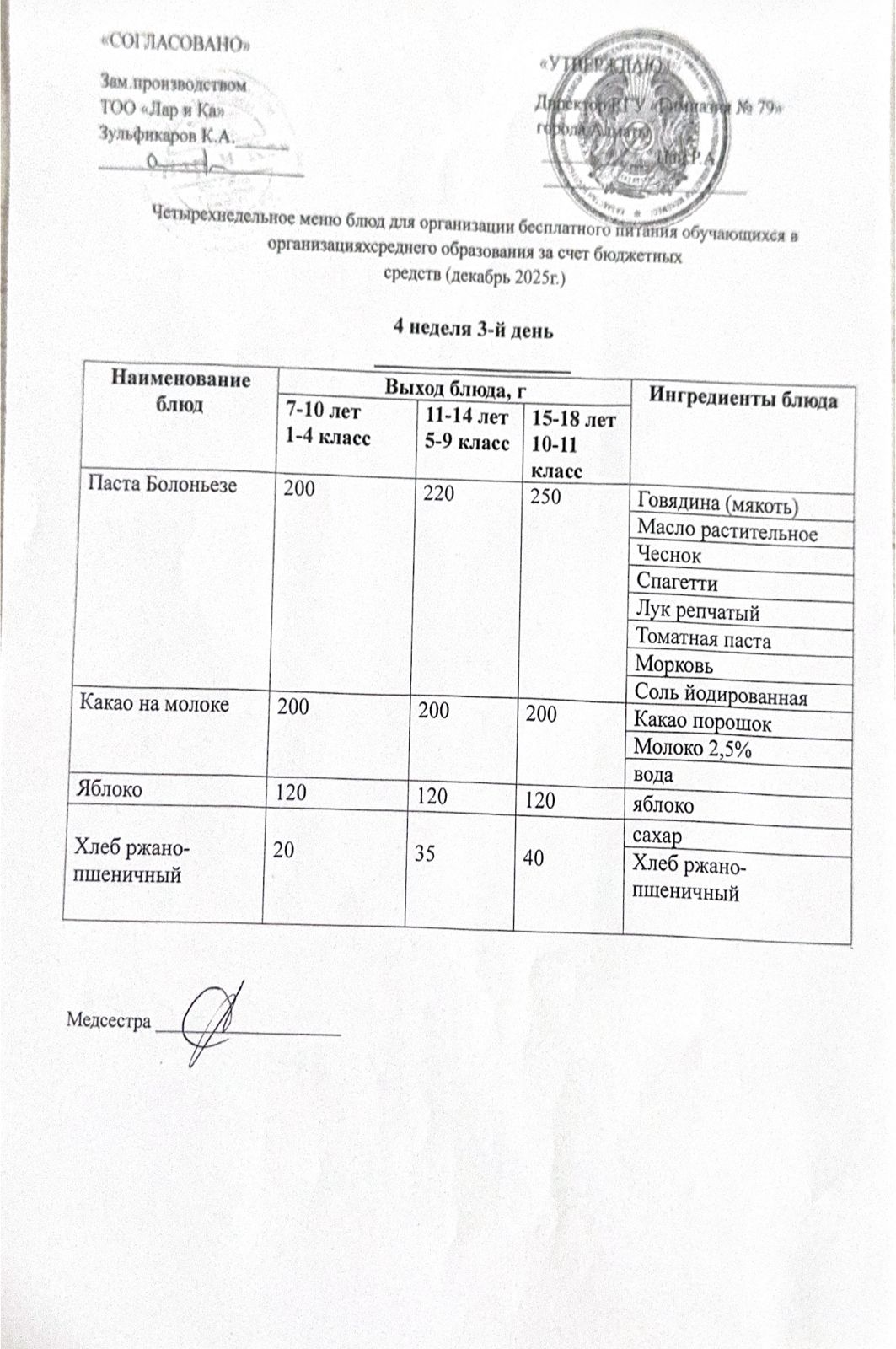 Тегін тамақтануды ұйымдастыруға арналған тағамдар мәзірі (қыс-көктем) / Меню блюд для организации бесплатного питания (зима-весна)