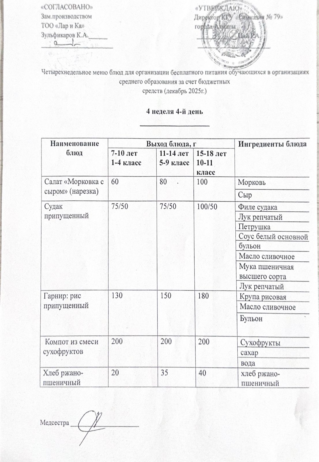 Тегін тамақтануды ұйымдастыруға арналған тағамдар мәзірі (қыс-көктем) / Меню блюд для организации бесплатного питания (зима-весна)
