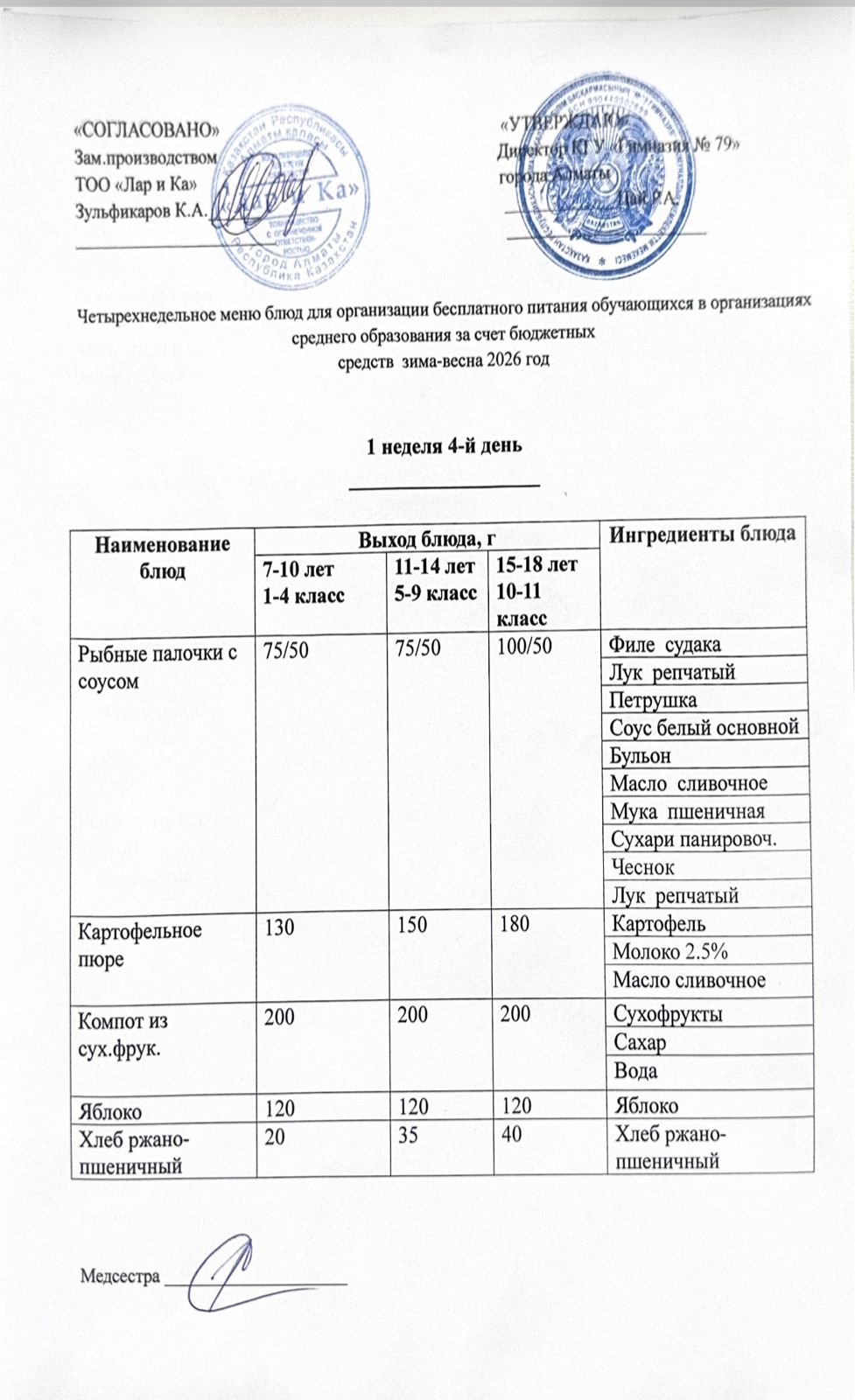 Тегін тамақтануды ұйымдастыруға арналған тағамдар мәзірі (қыс-көктем) / Меню блюд для организации бесплатного питания (зима-весна)