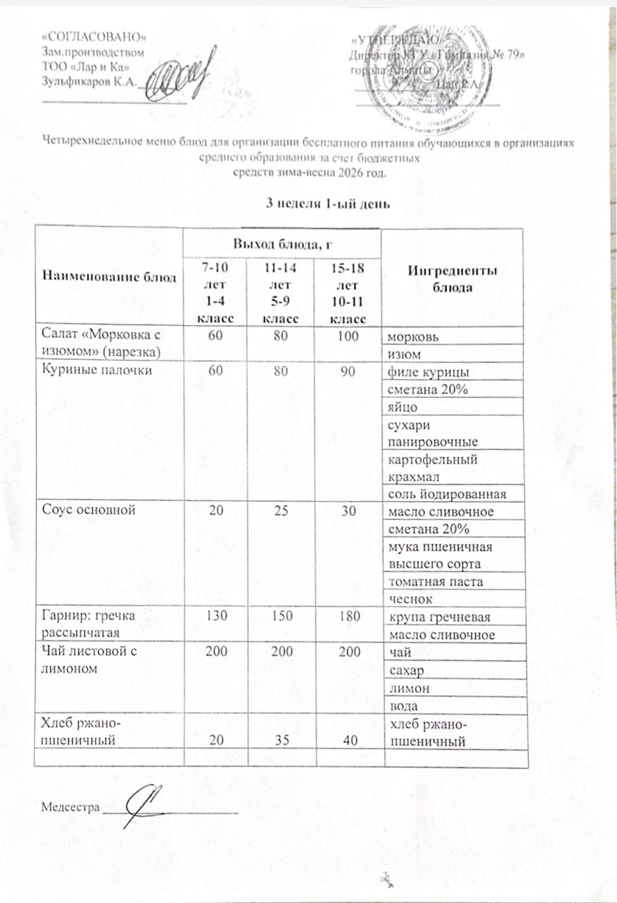 Тегін тамақтануды ұйымдастыруға арналған тағамдар мәзірі (қыс-көктем) / Меню блюд для организации бесплатного питания (зима-весна)