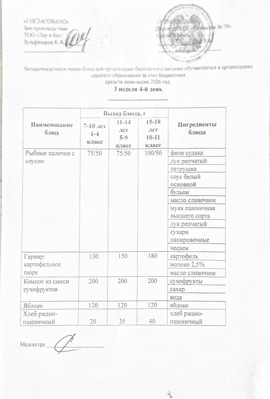 Тегін тамақтануды ұйымдастыруға арналған тағамдар мәзірі (қыс-көктем)