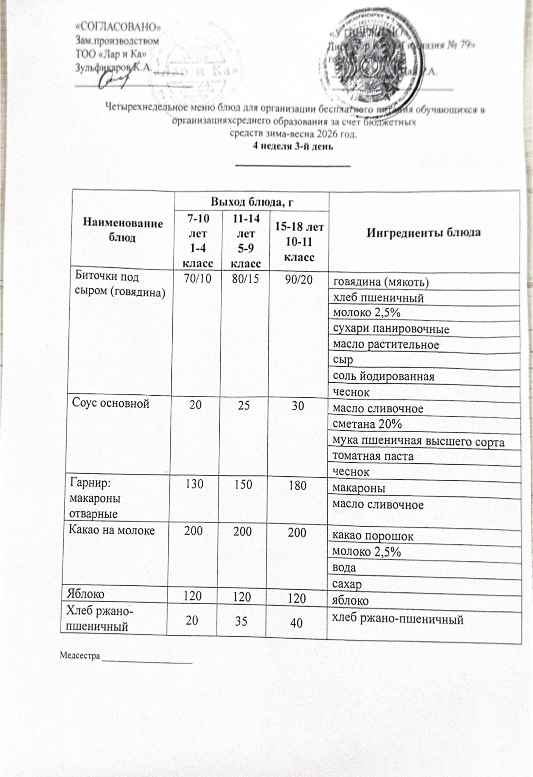 Тегін тамақтануды ұйымдастыруға арналған тағамдар мәзірі (қыс-көктем) / Меню блюд для организации бесплатного питания (зима-весна)