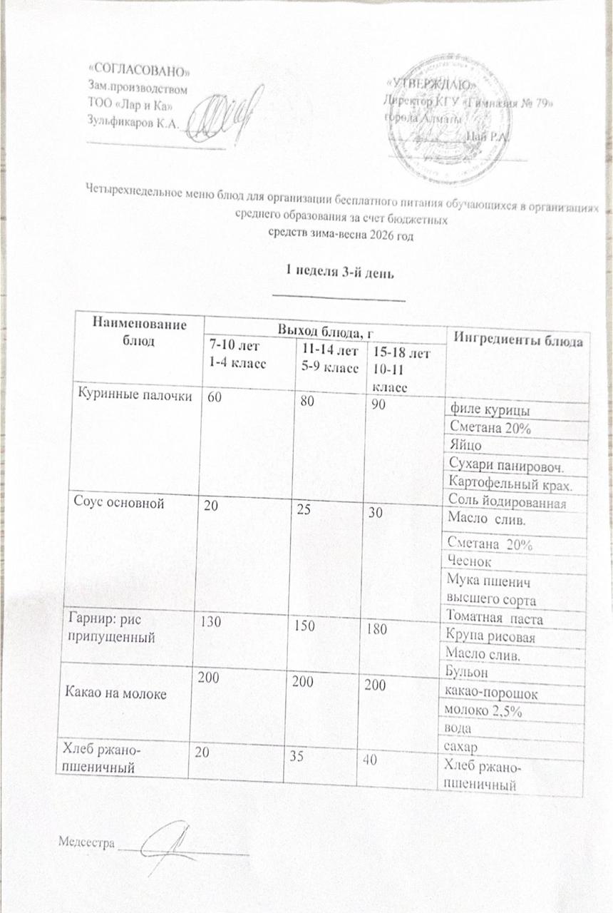 Тегін тамақтануды ұйымдастыруға арналған тағамдар мәзірі (қыс-көктем) / Меню блюд для организации бесплатного питания (зима-весна)