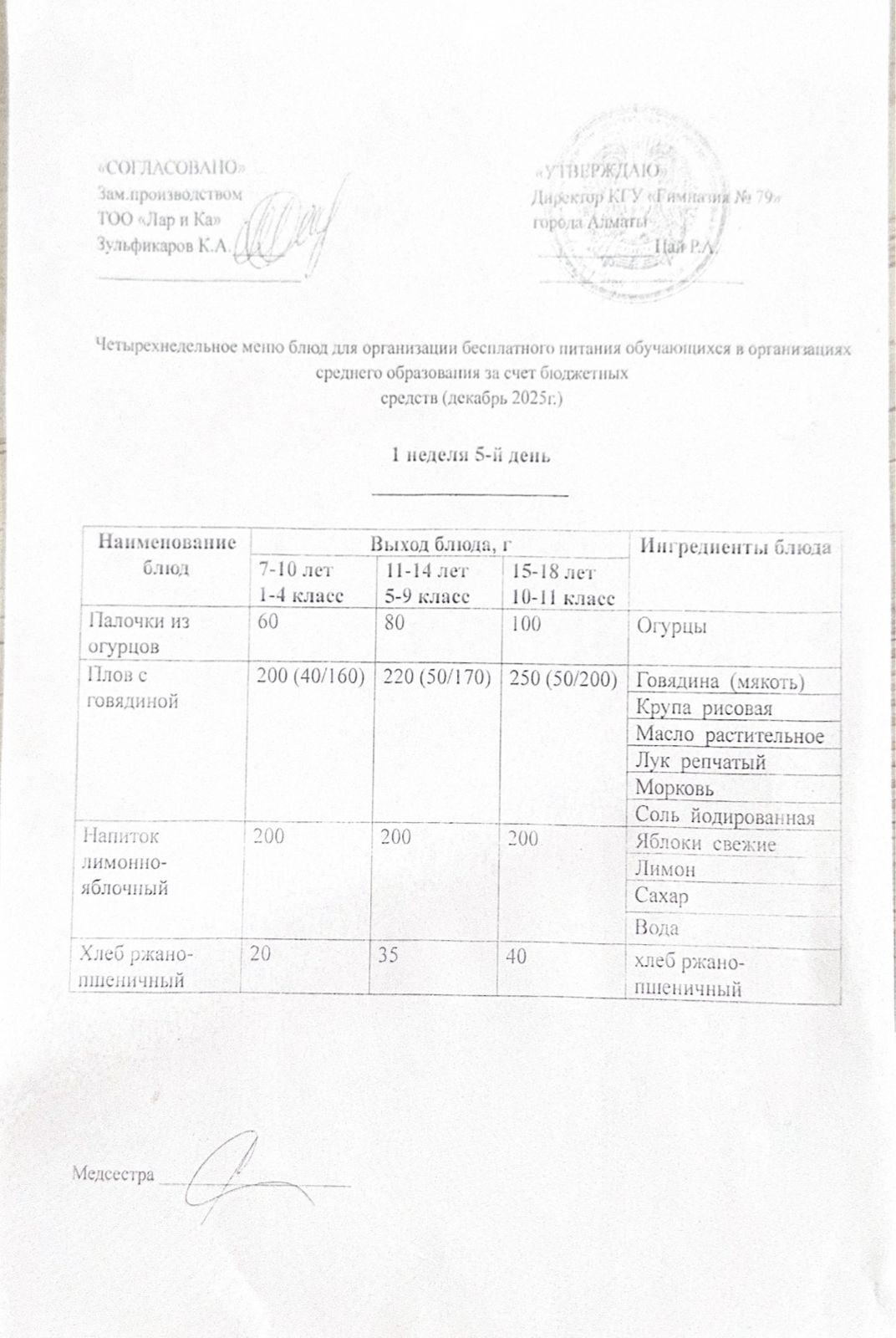 Тегін тамақтануды ұйымдастыруға арналған тағамдар мәзірі (қыс-көктем) / Меню блюд для организации бесплатного питания (зима-весна)