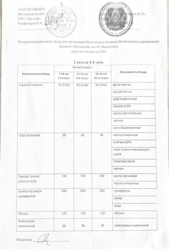 Тегін тамақтануды ұйымдастыруға арналған тағамдар мәзірі (қыс-көктем) / Меню блюд для организации бесплатного питания (зима-весна)