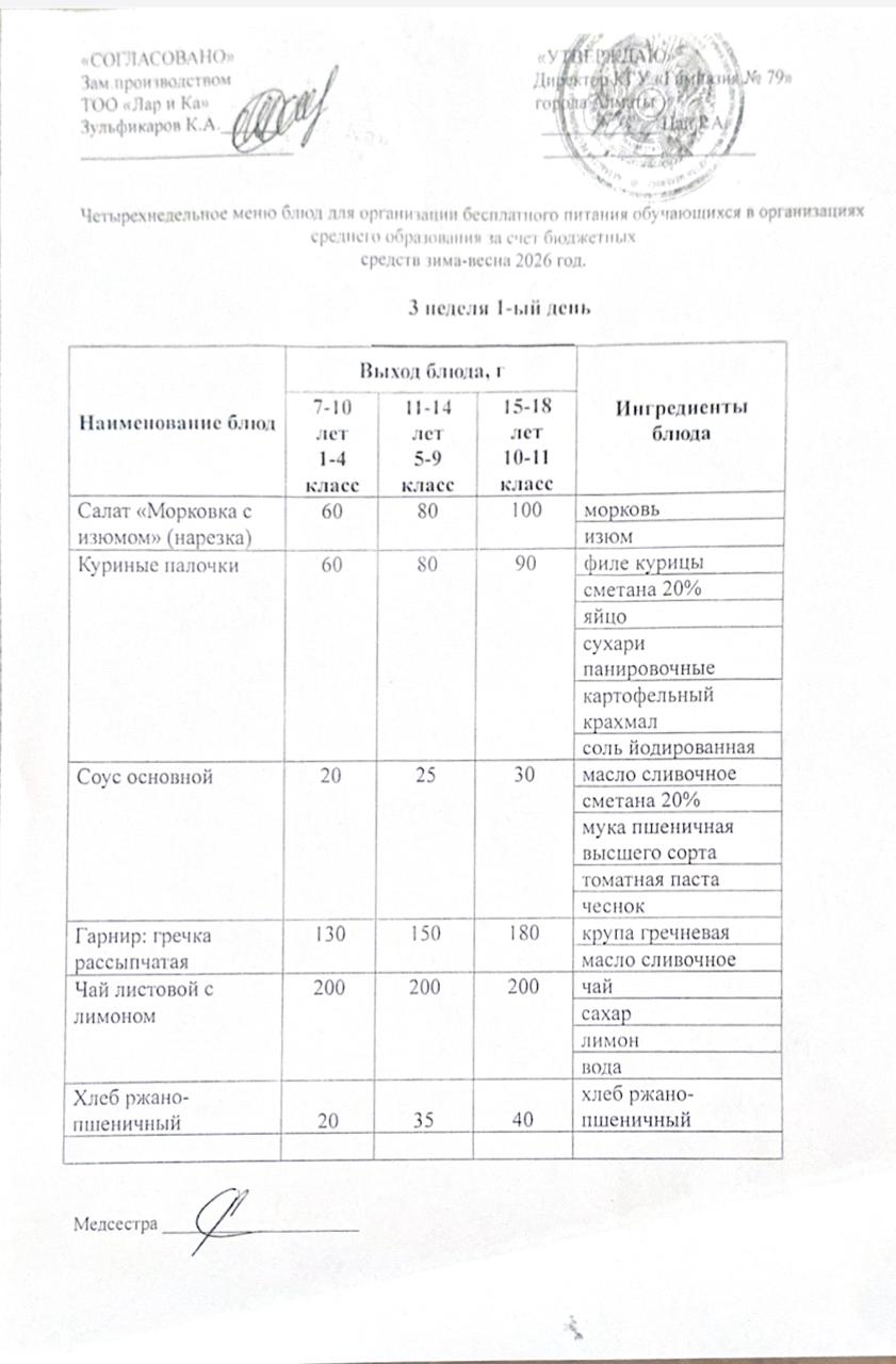 Тегін тамақтануды ұйымдастыруға арналған тағамдар мәзірі (қыс-көктем) / Меню блюд для организации бесплатного питания (зима-весна)