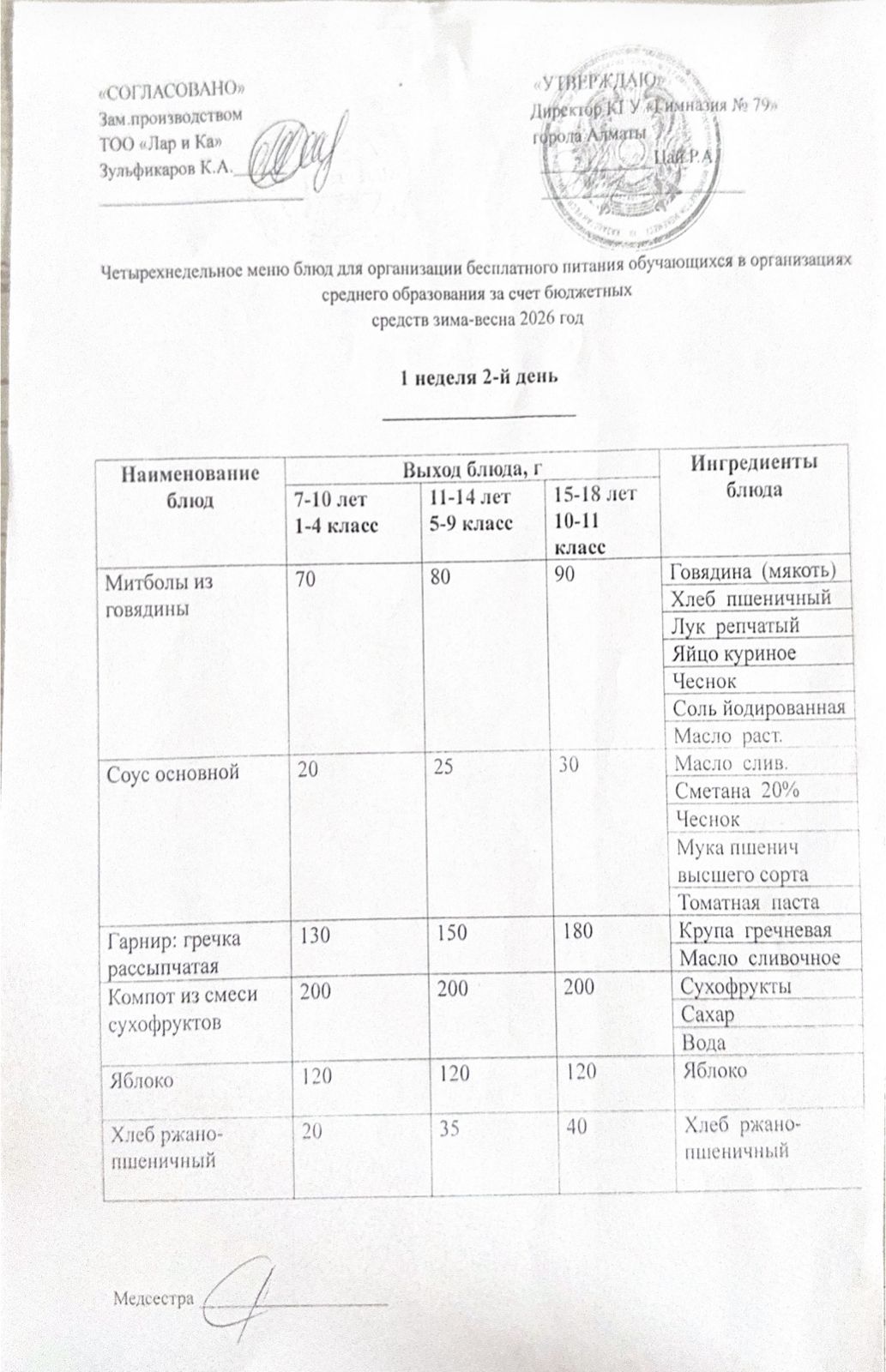 Тегін тамақтануды ұйымдастыруға арналған тағамдар мәзірі (қыс-көктем) / Меню блюд для организации бесплатного питания (зима-весна)