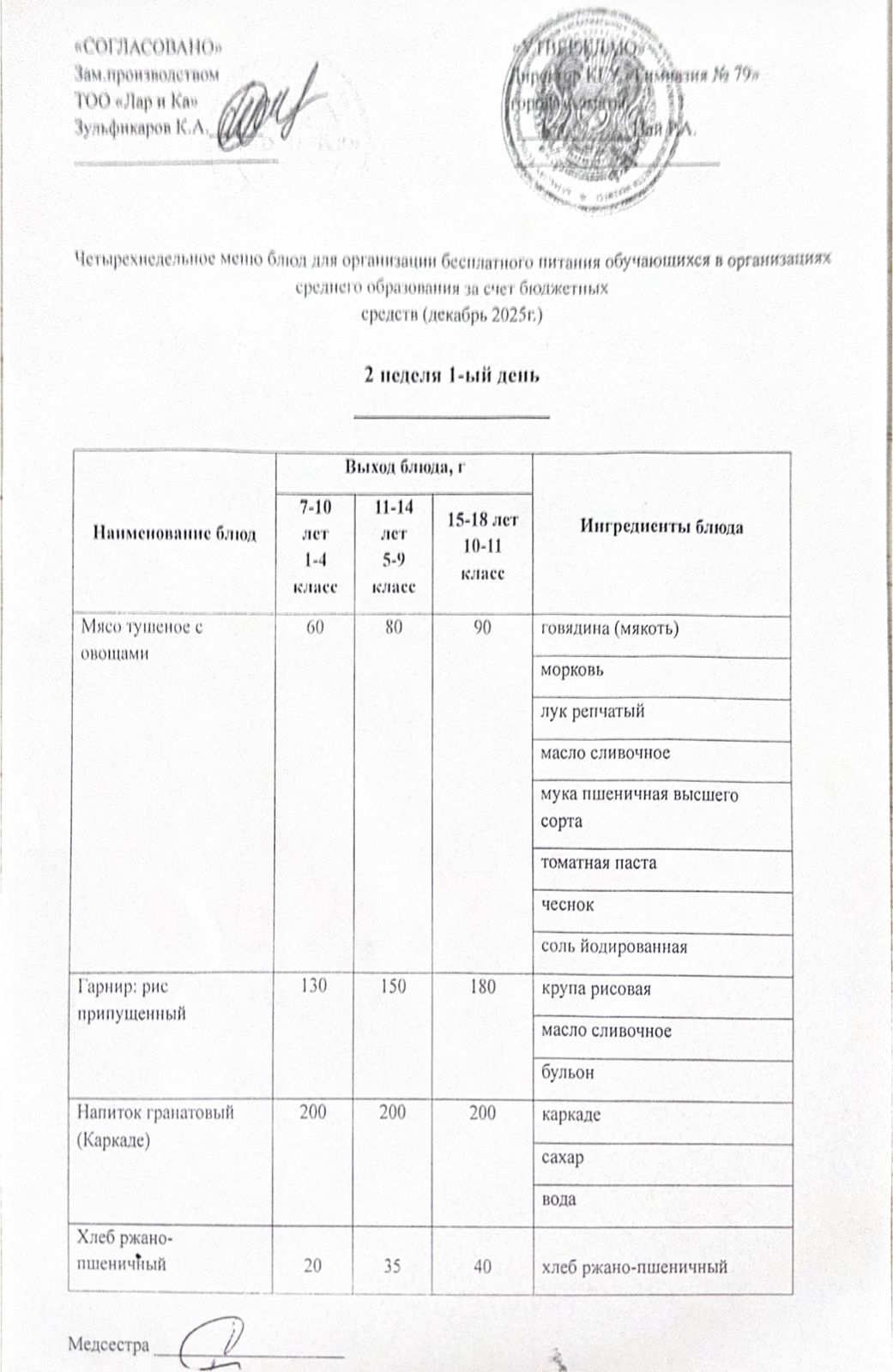 Тегін тамақтануды ұйымдастыруға арналған тағамдар мәзірі (қыс-көктем) / Меню блюд для организации бесплатного питания (зима-весна)