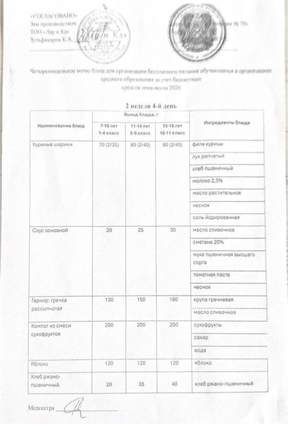 Тегін тамақтануды ұйымдастыруға арналған тағамдар мәзірі (қыс-көктем) / Меню блюд для организации бесплатного питания (зима-весна)